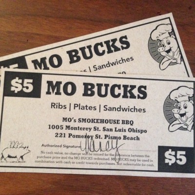 Redeemable at MO’s Smokehouse BBQ, Pismo Beach, CA.